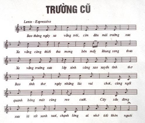 Bản nhạc Trường cũ dường như không được xuất bản mà chỉ lưu hành trong giới học sinh, sinh viên thời trước. Bản nhạc này ngắn và dễ nhớ. Chúng tôi cố gắng ký âm theo trí nhớ và ghi lại đây (2). Có thể không hoàn toàn chính xác, nhưng về cơ bản chắc là đúng. Rất mong bạn đọc nào biết được bài hát này xin bổ sung thêm.